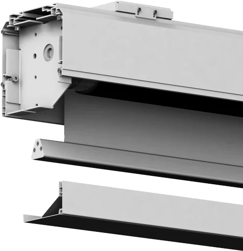 Velkoformátové motorové promítací plátno v segmentovém hliníkovém tubusu v moderním designu
