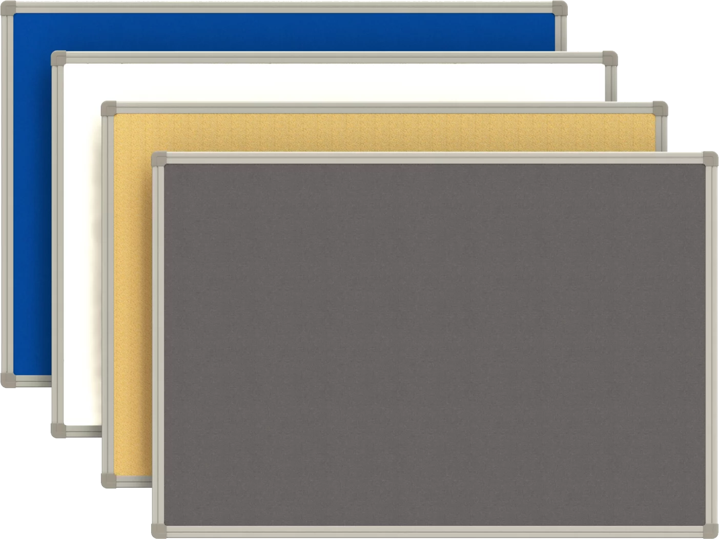 • Dostupné povrchy tabule: lakovaný bílý plech (magnetický, popisovatelný, za sucha stíratelný), korek nebo textilní povrch modrý, šedý (nástěnka)