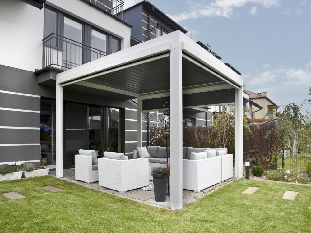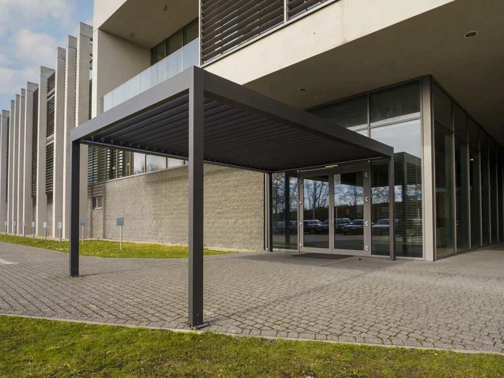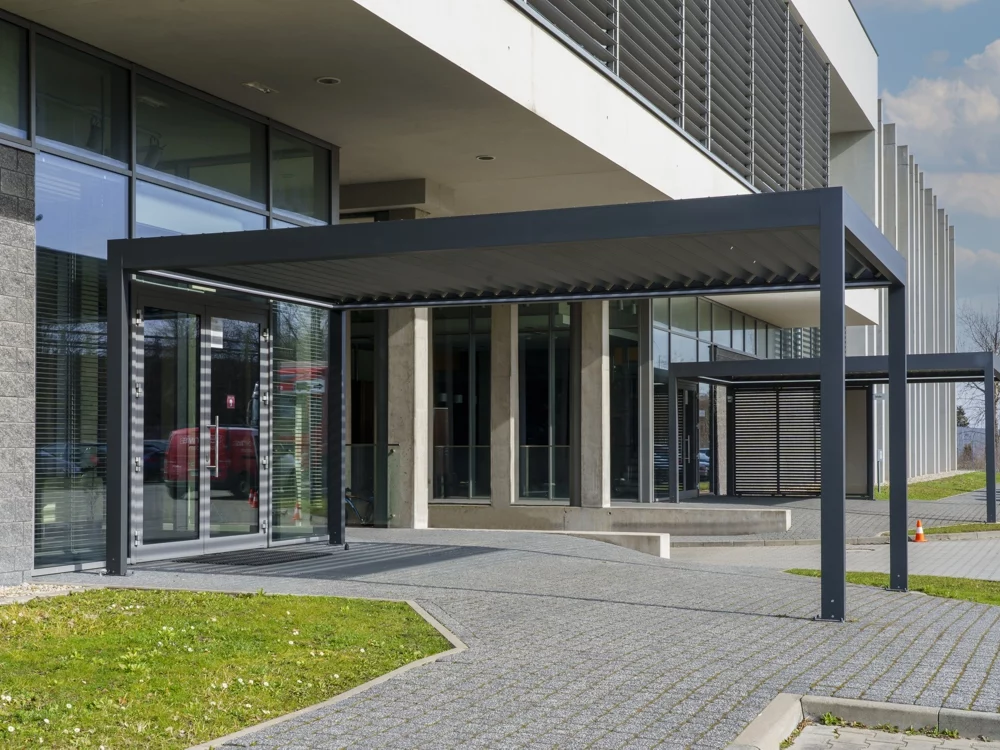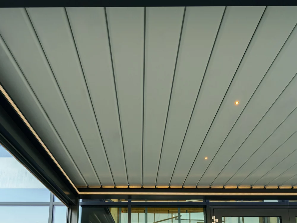 • Bioklimatická pergola s otočnou lamelovou střechou. Lamely fungující jako protidešťová zábrana zároveň umožňují regulaci průchodu slunečního záření a odvětrání přehřátého vzduchu pro dosažení ideálního klimatu v prostoru pergoly