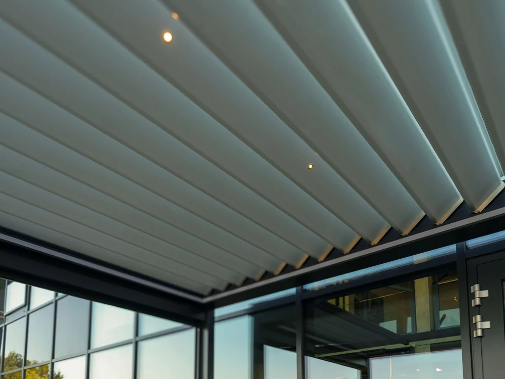 Bioklimatická pergola s otočnou lamelovou střechou a skrytým pohonem. Velikost jednoho modulu max. 4 metry